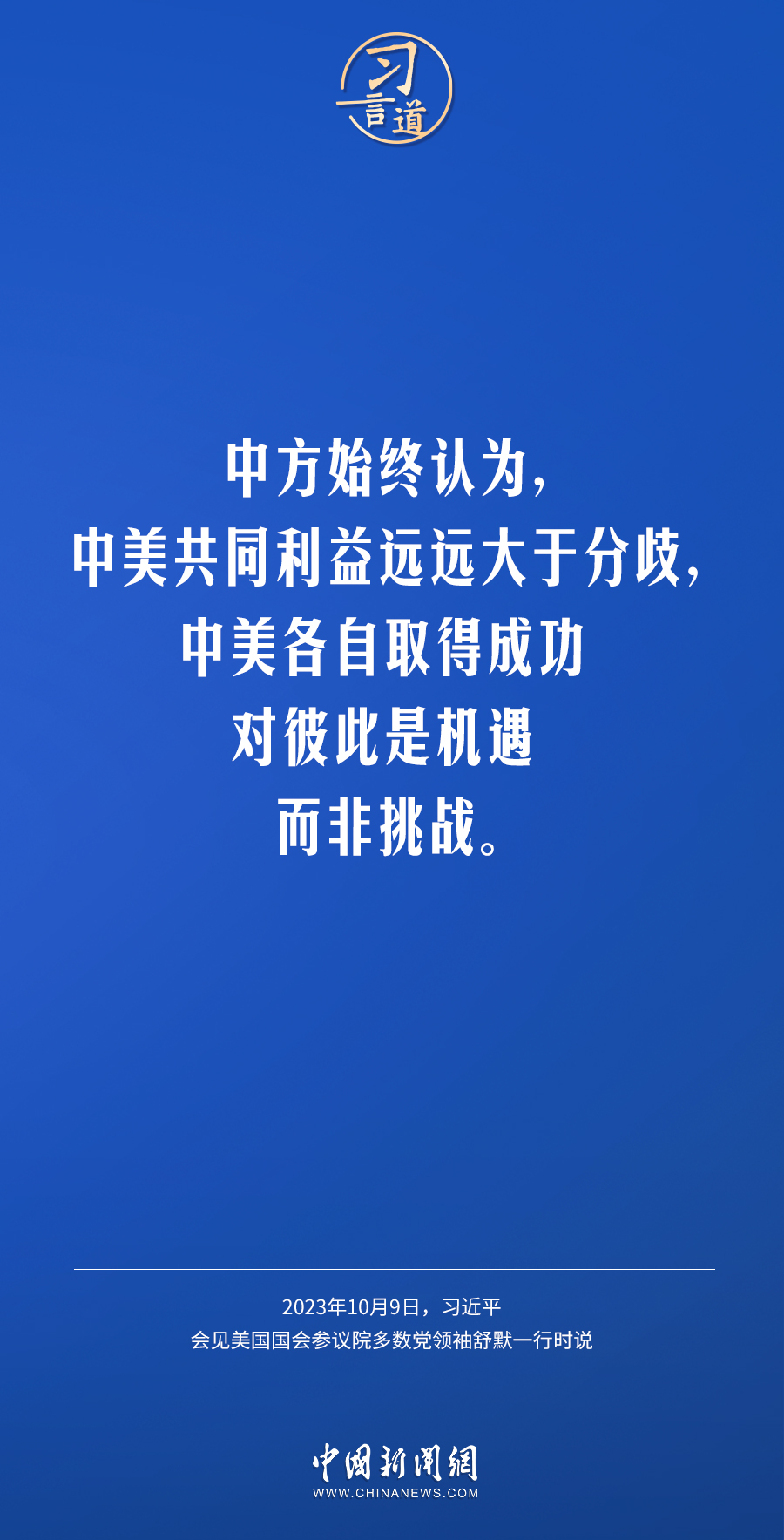 10月9日下午,國(guó)家主席習(xí)近平在人民大會(huì)堂會(huì)見(jiàn)美國(guó)國(guó)會(huì)參議院多數(shù)黨領(lǐng)袖舒默率領(lǐng)的美國(guó)國(guó)會(huì)參議院兩黨代表團(tuán)。習(xí)近平指出——
