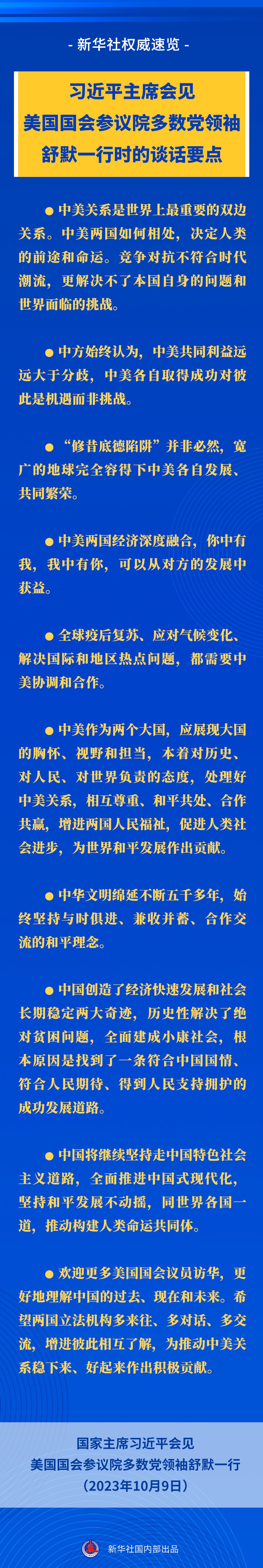 新華社權(quán)威速覽丨習近平主席會見美國國會參議院多數(shù)黨領(lǐng)袖舒默一行時的談話要點