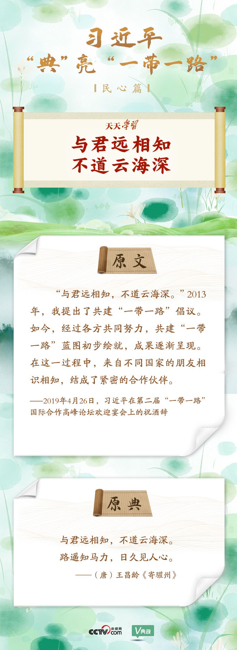 在國內(nèi)國際多個(gè)重要場(chǎng)合,習(xí)近平主席頻頻引經(jīng)據(jù)典,介紹“一帶一路”承載的厚重歷史,闡述“一帶一路”建設(shè)的理念和重大意義,描繪“一帶一路”美好的發(fā)展愿景。央視網(wǎng)《天天學(xué)習(xí)》欄目特選取習(xí)近平主席的部分用典,與您一起學(xué)習(xí)領(lǐng)會(huì)。