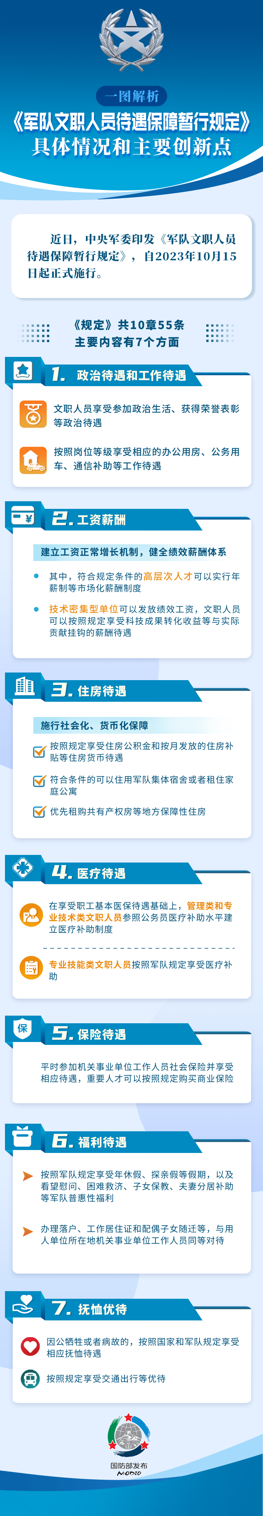 六是福利待遇。按照軍隊(duì)規(guī)定享受年休假、探親假等假期,以及看望慰問(wèn)、困難救濟(jì)、子女保教、夫妻分居補(bǔ)助等軍隊(duì)普惠性福利。辦理落戶(hù)、工作居住證和配偶子女隨遷等,與用人單位所在地機(jī)關(guān)事業(yè)單位工作人員同等對(duì)待。