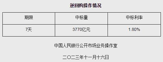 中新網(wǎng)11月16日電 據(jù)央行網(wǎng)站消息,為維護(hù)銀行體系流動(dòng)性合理充裕,2023年11月16日人民銀行以利率招標(biāo)方式開(kāi)展了3770億元逆回購(gòu)操作,中標(biāo)利率1.80%,期限為7天。具體情況如下: