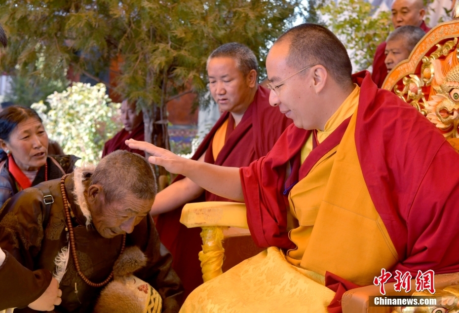 11月13日、14日,全國(guó)政協(xié)常委、中國(guó)佛教協(xié)會(huì)副會(huì)長(zhǎng)、中國(guó)佛教協(xié)會(huì)西藏分會(huì)會(huì)長(zhǎng)班禪額爾德尼·確吉杰布在日喀則扎什倫布寺為數(shù)萬(wàn)名信教群眾摸頂賜福。圖為11月13日,班禪為信眾摸頂賜福。