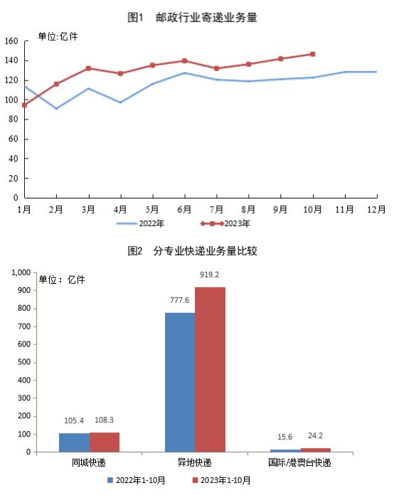 1-10月,同城快遞業(yè)務(wù)量累計(jì)完成108.3億件,同比增長(zhǎng)2.7%;異地快遞業(yè)務(wù)量累計(jì)完成919.2億件,同比增長(zhǎng)18.2%;國(guó)際/港澳臺(tái)快遞業(yè)務(wù)量累計(jì)完成24.2億件,同比增長(zhǎng)55.1%。