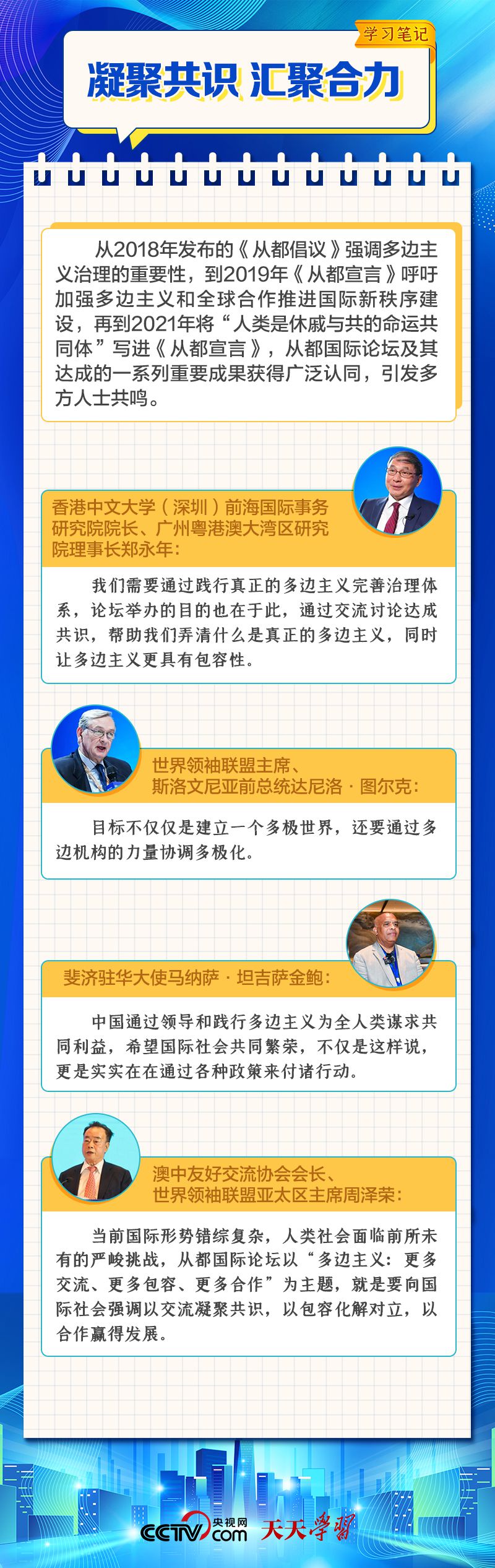 天天學(xué)習(xí) 12月4日,習(xí)近平主席在致“2023從都國際論壇”的賀信中強調(diào),面對前所未有的世界之變、時代之變和歷史之變,人類社會必須團結(jié)起來,堅持互學(xué)互鑒、開放包容、合作共贏,弘揚全人類共同價值,共同建設(shè)更加美好的世界。