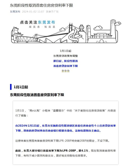 中新網(wǎng)1月2日電 據(jù)“東莞發(fā)布”微信公眾號(hào)消息,自2024年1月1日起,廣東省東莞市實(shí)施階段性取消轄區(qū)首套住房商業(yè)性個(gè)人住房貸款利率下限,具體的房貸利率由各商業(yè)銀行根據(jù)市場化、法制化原則自主確定。這意味著東莞現(xiàn)有首套房貸利率下限LPR-20BP將突破20BP的限定,不設(shè)下限。
