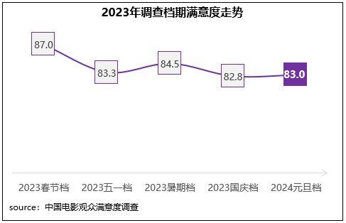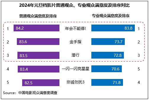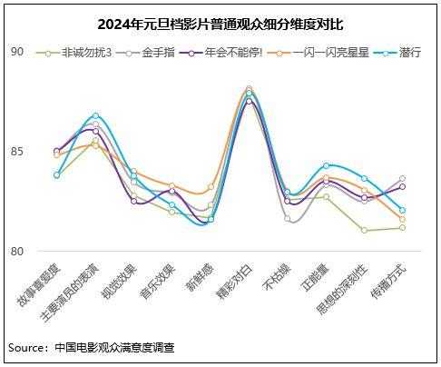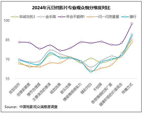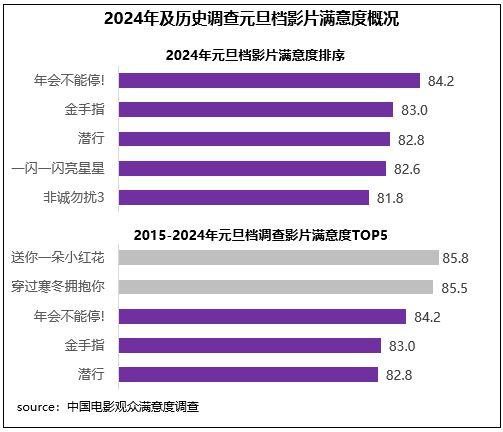 中國電影觀眾滿意度調(diào)查 2024年元旦檔調(diào)查結(jié)果顯示,元旦檔電影觀眾滿意度得分83.0分,環(huán)比增長0.2分。檔期以多元化且高契合度的影片供給陪伴觀眾跨年,得到了較高的滿意度評價,5部影片中有4部進入歷史調(diào)查19部元旦檔影片的滿意度前十,喜劇《年會不能停!》以84.2分領銜,《金手指》83.0分居第二位,《潛行》《一閃一閃亮星星》均超82分,《非誠勿擾3》超81分。