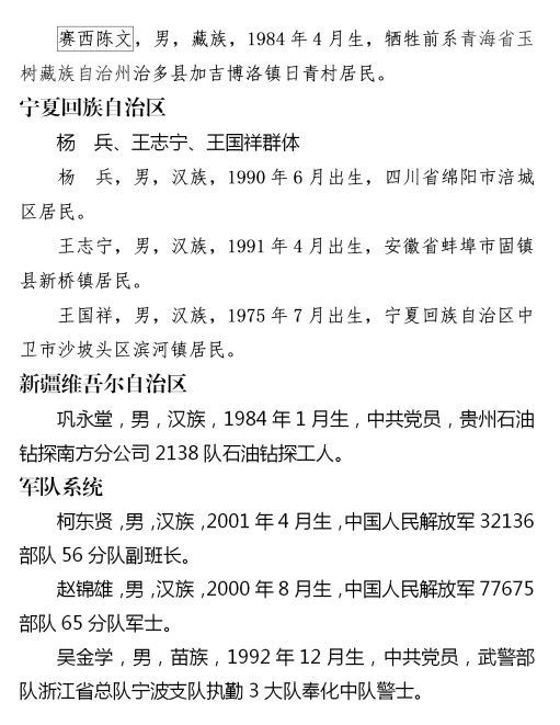 上榜勇士中有勇斗持刀犯罪嫌疑人身負(fù)重傷的張照杰、姚玉龍、王沖、王永芳;有從高橋跳水救人的周中磊、曾文文、周海;有從隨時可能爆炸的事故車輛中救出司機(jī)母子的湯益鑫;有冒著煤氣罐爆炸危險制服劫持孩子歹徒的蔡國榮;有救援被困電梯內(nèi)同事而導(dǎo)致左小腿截肢的翟元敏;有休假期間水下連續(xù)救人的現(xiàn)役軍人柯東賢、吳金學(xué)、趙錦雄;更有見義勇為英勇犧牲的李偉倫、張嘉俊、張可可、李峰武、安西德、何同猛、曾維龍、胡喜明、李振華、東周才仁、賽西陳文11位同志。勇士們見義勇為事跡鼓舞人心、振奮精神、催人奮進(jìn)。他們用血汗甚至生命秉承、詮釋了中華民族傳統(tǒng)美德,用奮不顧身的實(shí)際行動踐行了社會主義核心價值觀。