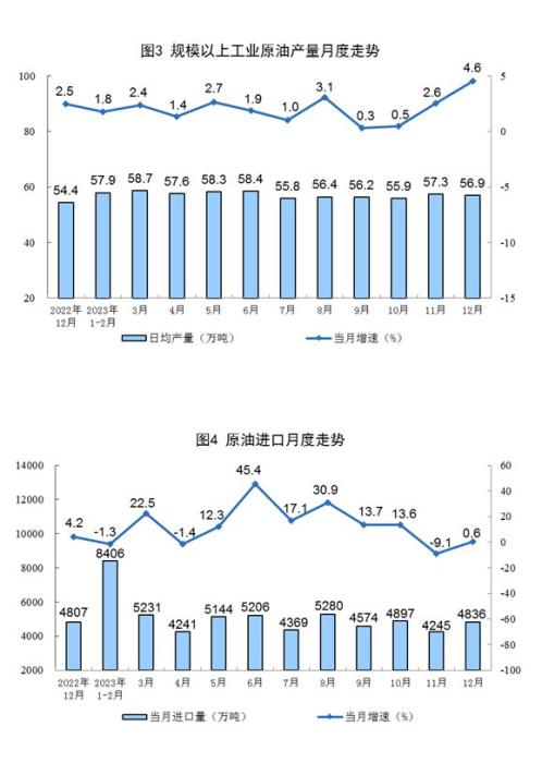 原油生產(chǎn)有所加快,進(jìn)口由降轉(zhuǎn)升。12月份,規(guī)上工業(yè)原油產(chǎn)量1765萬噸,同比增長4.6%,增速比11月份加快2.0個(gè)百分點(diǎn),日均產(chǎn)量56.9萬噸。進(jìn)口原油4836萬噸,同比增長0.6%,11月份為下降9.1%。