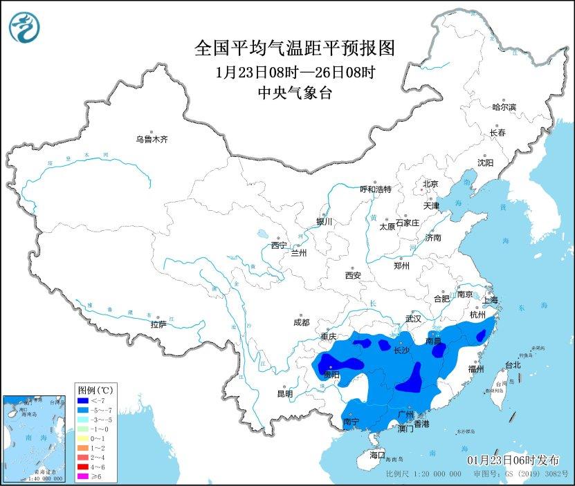 預(yù)計(jì),1月23日至25日,貴州、湖南、江西、浙江中南部、福建西部、廣東、廣西中東部等地最低氣溫或平均氣溫較歷史同期偏低5℃以上,其中,貴州中東部、湖南西北部、江西中南部、浙江南部、廣東西北部等地的部分地區(qū)偏低7℃以上,最低氣溫0℃線將位于廣西北部、廣東北部一帶。中央氣象臺(tái)1月23日06時(shí)繼續(xù)發(fā)布低溫藍(lán)色預(yù)警。