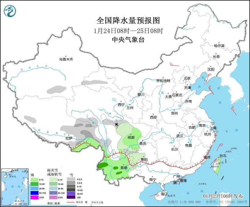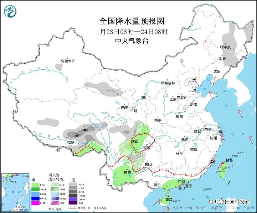 1月25日08時(shí)至26日08時(shí),西藏東部、青海南部、甘肅南部、川西高原北部、四川南部、貴州西部、云南東北部和西北部等地部分地區(qū)有小到中雪或雨夾雪。云南大部、貴州西南部等地部分地區(qū)有小到中雨(見圖5)。