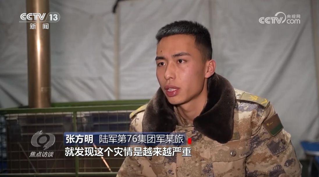 陸軍第76集團軍某旅章新禹:“據(jù)我們了解,他家五間房屋全部開裂,家人在院子里面搭了一個帳篷,我們優(yōu)先讓他回去解決自己的事情,然后再返回部隊?!?/p>