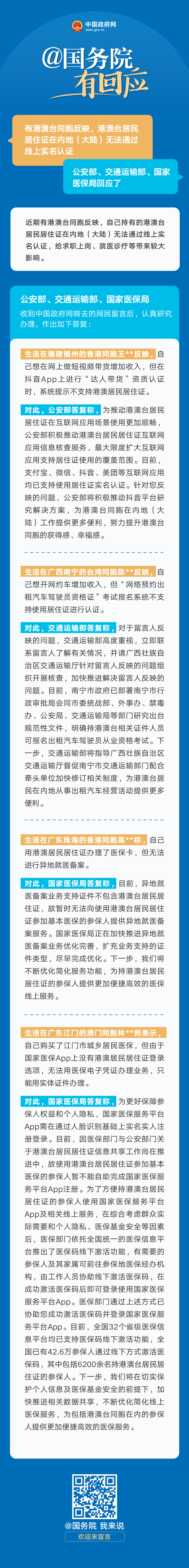 公安部、交通運(yùn)輸部、國家醫(yī)保局答網(wǎng)民關(guān)于“加快推進(jìn)港澳臺居民居住證線上實(shí)名認(rèn)證”的留言