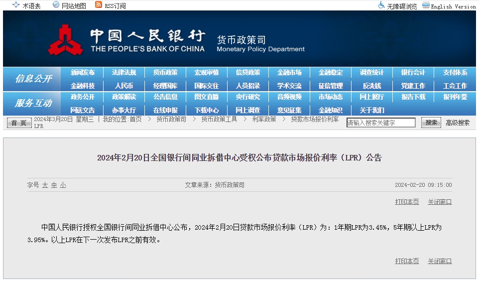 中新網(wǎng)3月20日電 據(jù)中國人民銀行網(wǎng)站消息,中國人民銀行授權(quán)全國銀行間同業(yè)拆借中心公布,2024年3月20日貸款市場報(bào)價(jià)利率(LPR)為:1年期LPR為3.45%,5年期以上LPR為3.95%。以上LPR在下一次發(fā)布LPR之前有效。3月LPR與2月保持一致,未作調(diào)整。