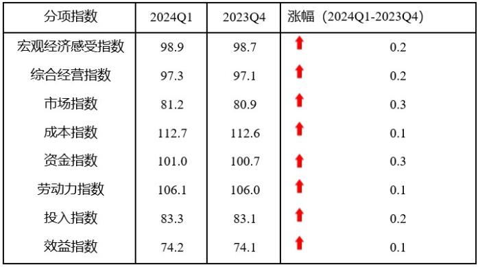 分項(xiàng)指數(shù)全面上升。一季度,宏觀經(jīng)濟(jì)感受指數(shù)、綜合經(jīng)營指數(shù)、市場(chǎng)指數(shù)、成本指數(shù)、資金指數(shù)、勞動(dòng)力指數(shù)、投入指數(shù)和效益指數(shù)均止跌回升,環(huán)比分別上升0.2、0.2、0.3、0.1、0.3、0.1、0.2和0.1點(diǎn)。資金指數(shù)和勞動(dòng)力指數(shù)處于景氣臨界值100以上,宏觀經(jīng)濟(jì)感受指數(shù)、綜合經(jīng)營指數(shù)、市場(chǎng)指數(shù)、投入指數(shù)和效益指數(shù)均處于景氣臨界值100以下,效益指數(shù)一直處于最低位。