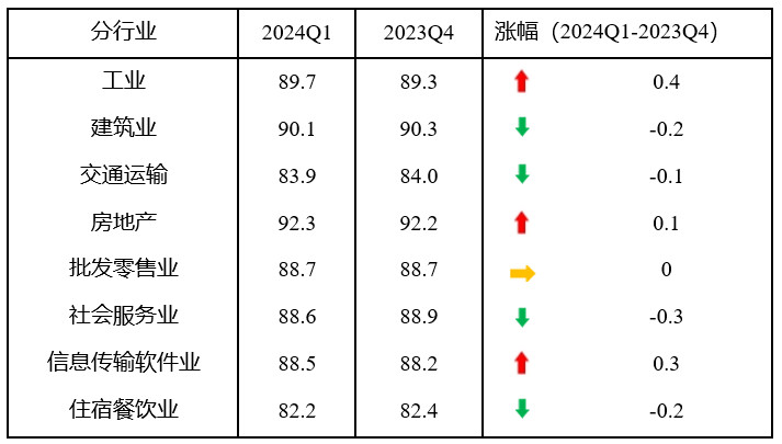 分行業(yè)指數(shù)3升1平4降。一季度,工業(yè)、房地產(chǎn)業(yè)和信息傳輸計(jì)算機(jī)服務(wù)軟件業(yè)指數(shù)比上季度分別上升0.4、0.1和0.3點(diǎn),批發(fā)零售業(yè)指數(shù)持平,建筑業(yè)、交通運(yùn)輸郵政倉儲(chǔ)業(yè)、社會(huì)服務(wù)業(yè)和住宿餐飲業(yè)指數(shù)比上季度分別下降0.2、0.1、0.3和0.2點(diǎn),社會(huì)服務(wù)業(yè)指數(shù)降幅較大。8個(gè)分行業(yè)指數(shù)均處于景氣臨界值100以下。