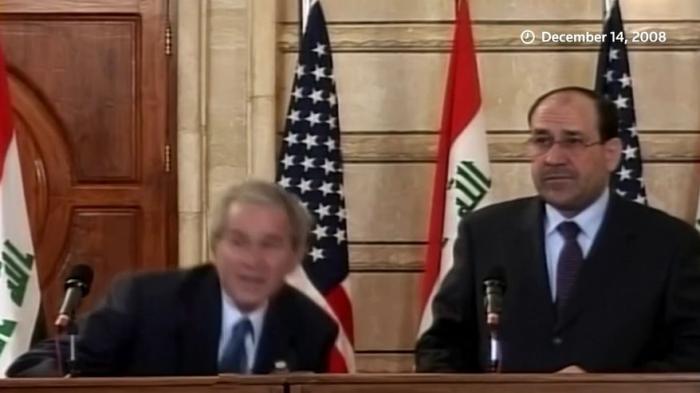 2008年12月,時任美國總統(tǒng)小布什在伊拉克首都巴格達的新聞發(fā)布會上,被伊拉克記者蒙塔達爾·扎伊迪扔鞋。圖片來源:路透社視頻截圖