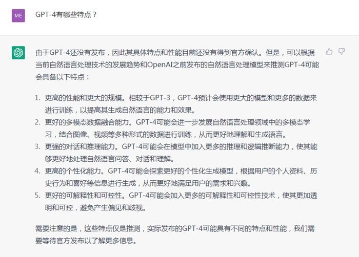 有意思的是,在GPT-4發(fā)布后,再去問ChatGPT和GPT-4“什么是GPT-4”,ChatGPT回答:GPT-4是OpenAI公司計劃開發(fā)的下一代自然語言處理模型,由于GPT-4還沒有發(fā)布,因此其具體特點和性能目前還沒有得到官方確認(rèn)。