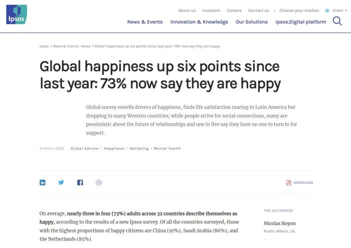調(diào)查結(jié)果顯示,平均而言,在32個(gè)國家中,近四分之三(73%)的成年人認(rèn)為自己很幸福。在所有接受調(diào)查的國家中,幸福感指數(shù)最高的國家是中國(91%),其后是沙特阿拉伯(86%)、荷蘭(85%)、印度(84%)、巴西(83%)。