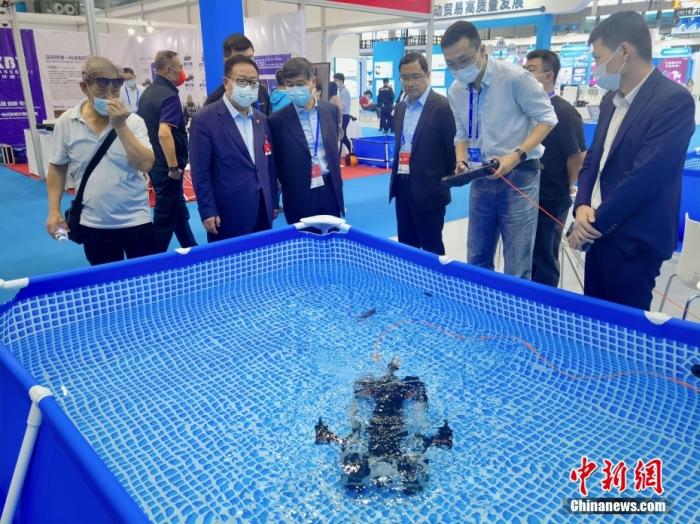 資料圖:2022年11月16日,在深圳舉行的第二十四屆中國國際高新技術(shù)成果交易會上,參展商攜“黑科技”產(chǎn)品亮相高交會。圖為深圳企業(yè)研制的潛鮫P200 PRO行業(yè)級水下機器人。 中新社記者 陳文 攝