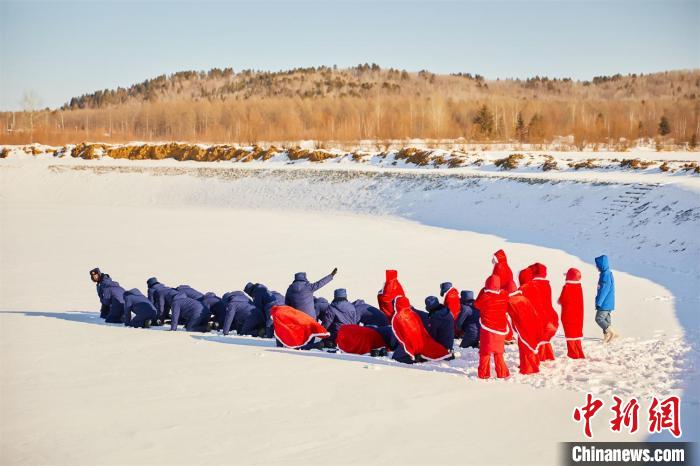 “傻嘟嘟”團(tuán)隊在雪地拍攝“火箭發(fā)射”視頻 黑龍江省塔河縣文旅局供圖