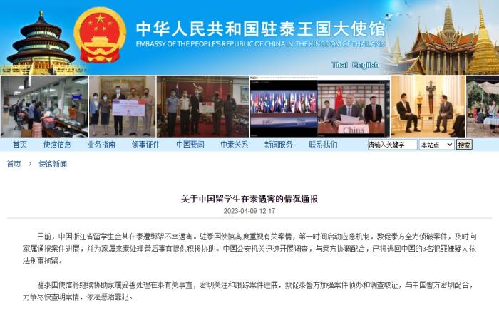 中使館通報留學(xué)生在泰遇害案:高度重視,敦促泰方全力偵破