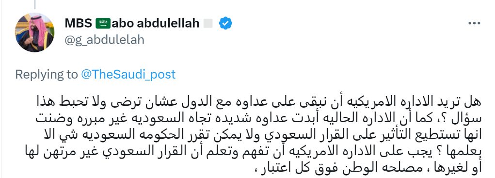 沙特網(wǎng)友阿博·阿卜杜勒拉言辭激烈地批評:“只有我們與其他國家保持敵意美國才不會失望嗎?美國政府對沙特表現(xiàn)出強烈而無理的敵意,居然還認為它可以影響沙特的決定、沙特只能在它的指導(dǎo)下做事?美國政府必須了解,沙特的決定不依附于任何其他人。祖國的利益高于一切。