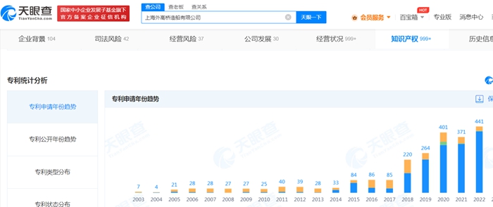 天眼查顯示,近三年,外高橋造船專利申請數(shù)量猛增,2020年為401件,2021年371件,2022年達到441件。這其中有不少專利涉及到大型郵輪,例如“大型郵輪反彈式水封地漏”“大型郵輪醫(yī)院抽風管過濾裝置”等。