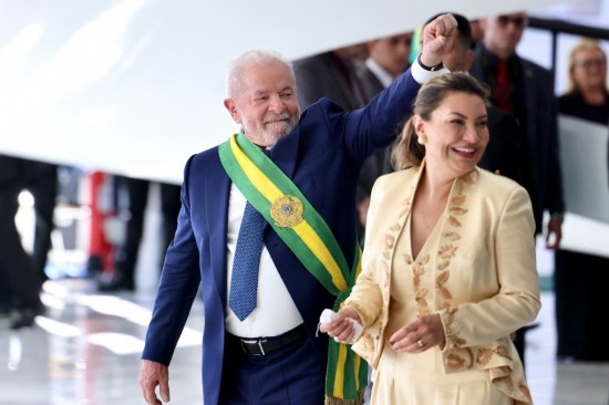 1月1日,在巴西首都巴西利亞,巴西總統(tǒng)盧拉(左)身披象征總統(tǒng)權力的綬帶向支持者揮手示意。(新華社記者劉彬攝)