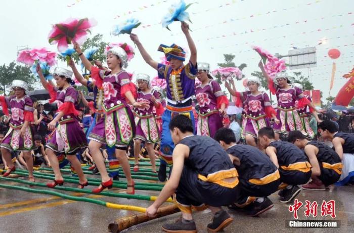 壯族民眾跳竹竿舞。林浩 攝