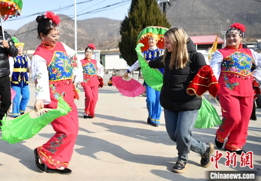 2023年2月,中國傳統(tǒng)節(jié)日元宵節(jié),河北省石家莊市井陘縣小作鎮(zhèn)桃林坪村,俄羅斯留學(xué)生曉燕(右二)體驗非遺“井陘拉花”。翟羽佳 攝