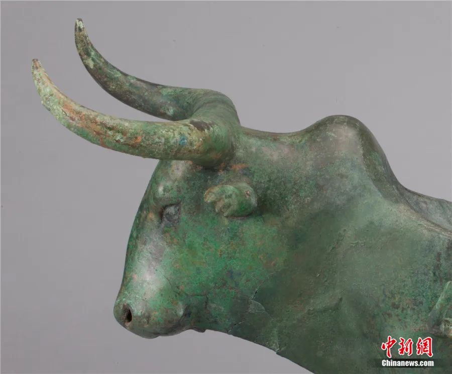 ?;~案的器物主體是一頭封牛,其特點在于兩邊牛角向內(nèi)彎曲,牛角尖向上翹起,牛脖子上有一個隆起部分,像駱駝的駝峰。封牛曾是亞洲的主要牛種之一,云南地區(qū)的封牛則通過有著“南方絲綢之路”之稱的蜀身毒道,從印度至緬甸,后進入云南。這條交通要道促進了滇國與其他文明在商貿(mào)、文化上的交流融合。