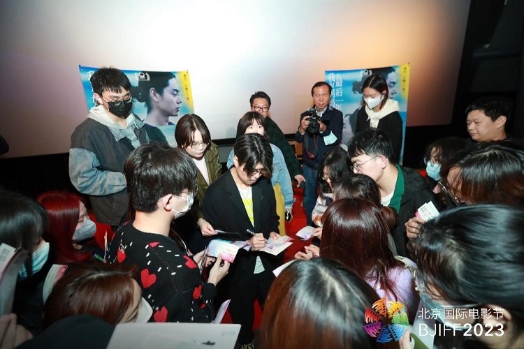北京電影節(jié)展映后,川村元?dú)鉃榉劢z簽名。北京電影節(jié)供圖