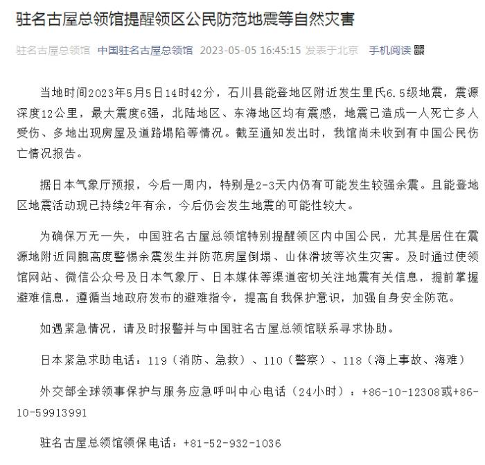 為確保萬無一失,中國駐名古屋總領館特別提醒領區(qū)內中國公民,尤其是居住在震源地附近同胞高度警惕余震發(fā)生并防范房屋倒塌、山體滑坡等次生災害。及時通過使領館網站、微信公眾號及日本氣象廳、日本媒體等渠道密切關注地震有關信息,提前掌握避難信息,遵循當?shù)卣l(fā)布的避難指令,提高自我保護意識,加強自身安全防范。