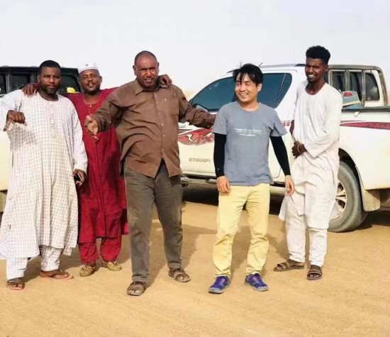 岳遠志(右二)在蘇丹與當?shù)嘏笥押嫌?。受訪者供圖