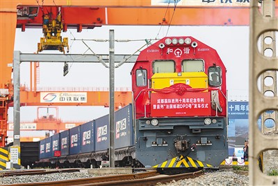 中歐班列是中法進(jìn)出口貿(mào)易的重要橋梁。圖為4月26日,為紀(jì)念成都國(guó)際班列十周年而開(kāi)行的“法國(guó)郵政DPD專列”在四川省成都市青白江區(qū)國(guó)際鐵路港首發(fā)。