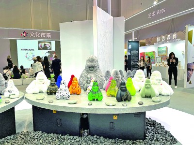 在中東歐展區(qū)的文化市集上,中國與中東歐國家的當(dāng)代藝術(shù)品同臺(tái)展出。其中,最吸引參觀者目光的,當(dāng)屬展臺(tái)正中擺放的一系列形態(tài)各異的中國藝術(shù)家原創(chuàng)IP形象“大衛(wèi)猿”雕塑或毛絨玩具。創(chuàng)作者袁澤銘介紹,本次展出的“大衛(wèi)猩球”項(xiàng)目邀請包括中國以及波黑、匈牙利、羅馬尼亞等中東歐國家在內(nèi)的全球藝術(shù)家為“大衛(wèi)猿”添加各自獨(dú)特的涂裝,體現(xiàn)了不同國家藝術(shù)家之間的文化交流以及藝術(shù)可能性的碰撞。