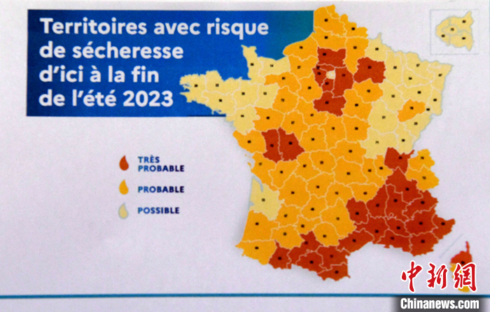 法國官方本周發(fā)表的一份最新報告顯示,法國今年炎熱干旱和水資源短缺問題可能比去年更加嚴重。報告公布的地圖標明了今年夏季面臨干旱的省份。法國本土96個省份中有28個省份面臨很高的干旱風險,這其中包括地中海沿岸多個省份和巴黎大區(qū)多個省份。 中新社記者 李洋 攝