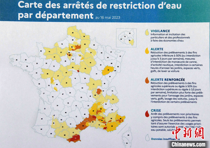 法國官方本周發(fā)表的一份最新報告顯示,法國今年炎熱干旱和水資源短缺問題可能比去年更加嚴重。報告公布的地圖標明了需要限制用水的省份。 中新社記者 李洋 攝