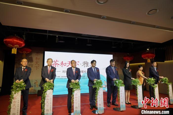 當地時間23日,“茶和天下·雅集”活動開幕式暨茶韻山水——“綠水青山就是金山銀山”浙江省文旅圖片展在首爾中國文化中心舉行。圖為活動啟幕儀式。中新社記者 劉旭 攝