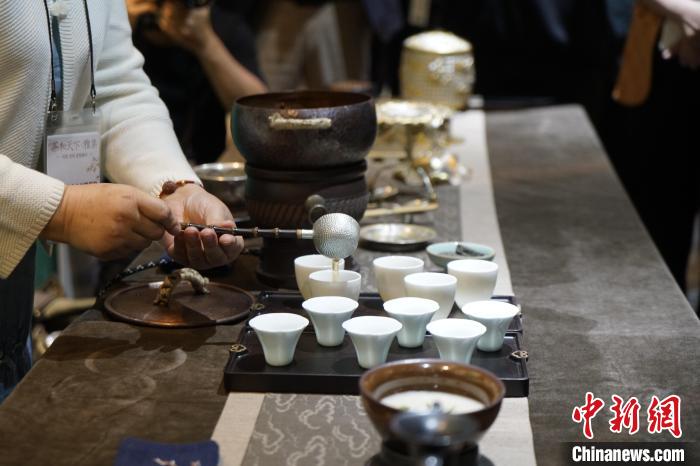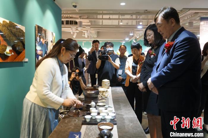 當地時間23日,“茶和天下·雅集”活動開幕式暨茶韻山水——“綠水青山就是金山銀山”浙江省文旅圖片展在首爾中國文化中心舉行。圖為長興紫筍茶體驗。中新社記者 劉旭 攝