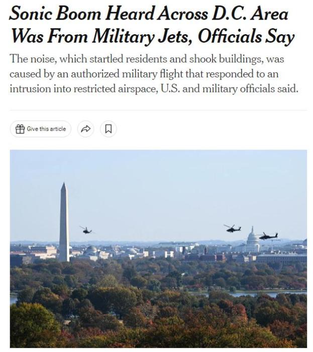 當(dāng)?shù)貢r間4日,一架塞斯納輕型飛機疑似闖入華盛頓上空,美軍F-16噴氣式戰(zhàn)斗機緊急起飛高速追擊,并在美國首都上空引發(fā)音爆。期間,美軍試圖與塞斯納飛機上的飛行員建立聯(lián)系。