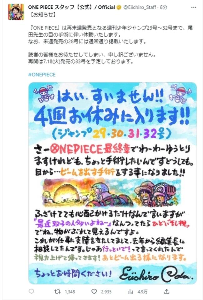 其官網(wǎng)還發(fā)布了尾田榮一郎在自己的手繪插畫上寫的“請假條”。他表示:“非常抱歉,我將休息四周時間。《航海王》雖然已經(jīng)進入終章,但由于眼睛的散光很嚴(yán)重,看東西時出現(xiàn)重影,所以需要做個手術(shù)。請給我一些時間(修養(yǎng)一下)?!?/p>
