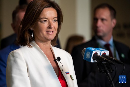 6月6日,在位于紐約的聯(lián)合國(guó)總部,斯洛文尼亞外長(zhǎng)塔尼婭·法永在斯洛文尼亞當(dāng)選聯(lián)合國(guó)安理會(huì)非常任理事國(guó)后在記者見面會(huì)上講話。新華社發(fā)(聯(lián)合國(guó)供圖/洛伊·費(fèi)利佩攝)