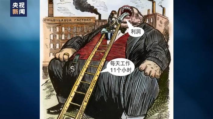 在這張漫畫中,一名瘦削的童工一天工作11個小時,將利潤送進貪婪的雇主口中,將他們養(yǎng)得腦滿腸肥。