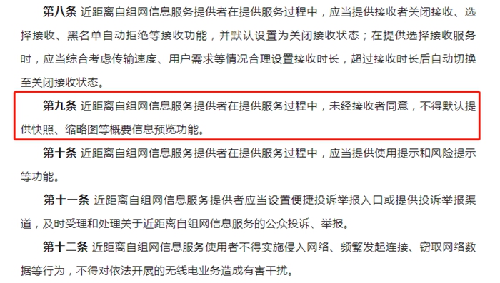 特別要注意的是,征求意見稿還提出“近距離自組網(wǎng)信息服務(wù)提供者在提供服務(wù)過程中,未經(jīng)接收者同意,不得默認(rèn)提供快照、縮略圖等概要信息預(yù)覽功能”。如前文所述,目前隔空投送存儲(chǔ)失敗選擇使用“文件”打開時(shí),在未完全接收的情況下可顯示信息縮略圖。