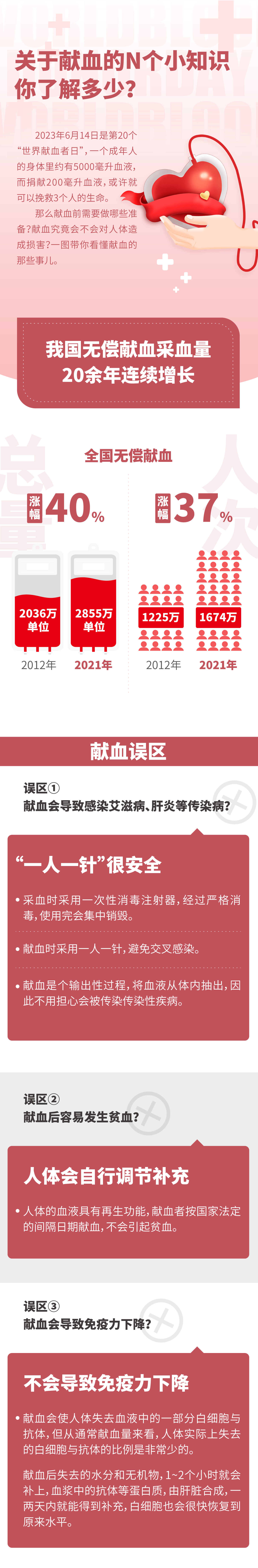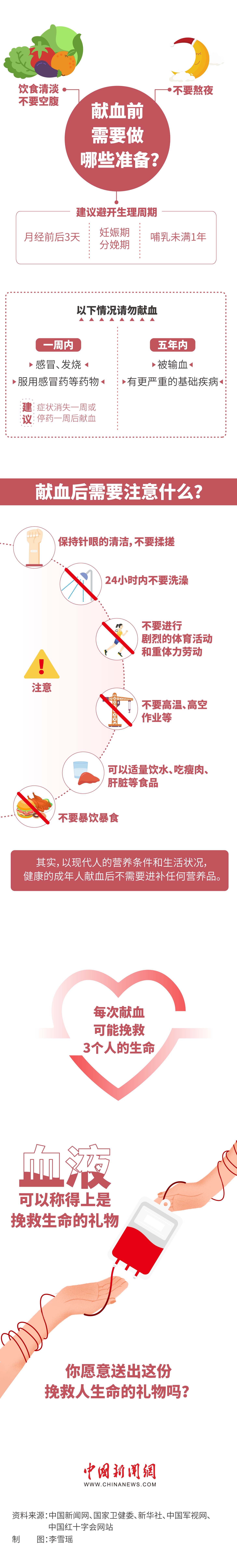 2023年6月14日是第20個(gè)“世界獻(xiàn)血者日”,一個(gè)成年人的身體里約有5000毫升血液,而捐獻(xiàn)200毫升血液,或許就可以挽救3個(gè)人的生命。那么獻(xiàn)血前需要做哪些準(zhǔn)備?獻(xiàn)血究竟會(huì)不會(huì)對(duì)人體造成損害?戳圖帶你看懂獻(xiàn)血那些事兒↓↓↓