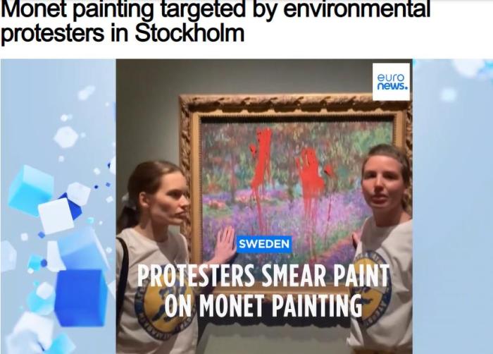 據(jù)法新社報(bào)道,這兩名女性環(huán)保主義者屬于瑞典本土組織“Restore Wetlands(恢復(fù)濕地)”,她們?cè)诋?huà)作表面的保護(hù)玻璃上涂紅漆,并在手上涂膠水把手粘在玻璃上。這兩人為護(hù)士和實(shí)習(xí)護(hù)士。Restore Wetlands在臉書(shū)頁(yè)面上發(fā)布了現(xiàn)場(chǎng)視頻。