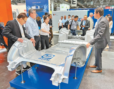 在中國壓鑄機制造商伊之密集團展位前,該集團與中國一家整車制造企業(yè)共同完成的“超大型一體化壓鑄件”一亮相就受到廣泛關(guān)注。伊之密壓鑄機事業(yè)部產(chǎn)品經(jīng)理張敦吉告訴記者,該產(chǎn)品為一體化壓鑄的汽車后地板,是全球最大的大型一體化壓鑄結(jié)構(gòu)件之一。一體化壓鑄技術(shù)是制造新能源汽車的關(guān)鍵技術(shù),采用該技術(shù)的鋁合金后地板總成的總重量最輕能達到鋼結(jié)構(gòu)的1/3,生產(chǎn)時間也從兩個小時縮短至3分鐘,同時還大幅減少了車身零件數(shù)量和焊接點,有效減少了能源消耗和成本。