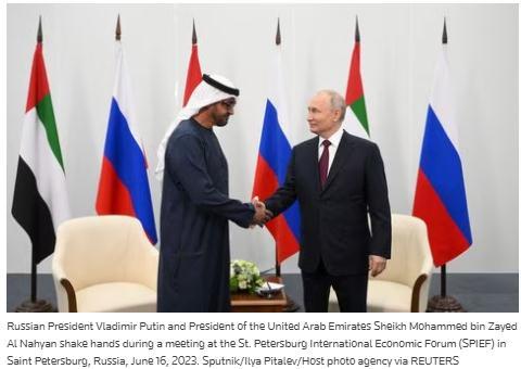 當(dāng)?shù)貢r(shí)間16日,阿聯(lián)酋總統(tǒng)穆罕默德·本·扎耶德·阿勒納哈揚(yáng)與俄羅斯總統(tǒng)普京在圣彼得堡國際經(jīng)濟(jì)論壇會(huì)晤。圖片來源:路透社報(bào)道截圖