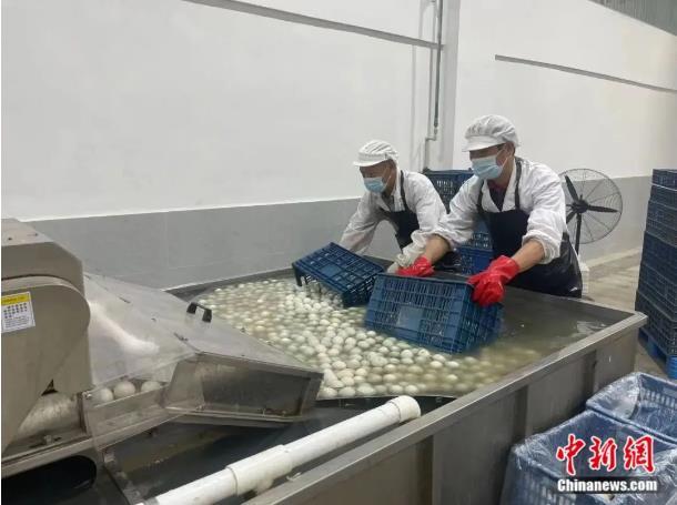 “公司現(xiàn)有鴨蛋加工生產(chǎn)線三、四條,單天產(chǎn)能達(dá)到20萬枚。此外還有15家農(nóng)戶和我們合作,以此來保證供應(yīng)量?!备哙]鴨集團(tuán)生產(chǎn)管理部副部長陳菁說。